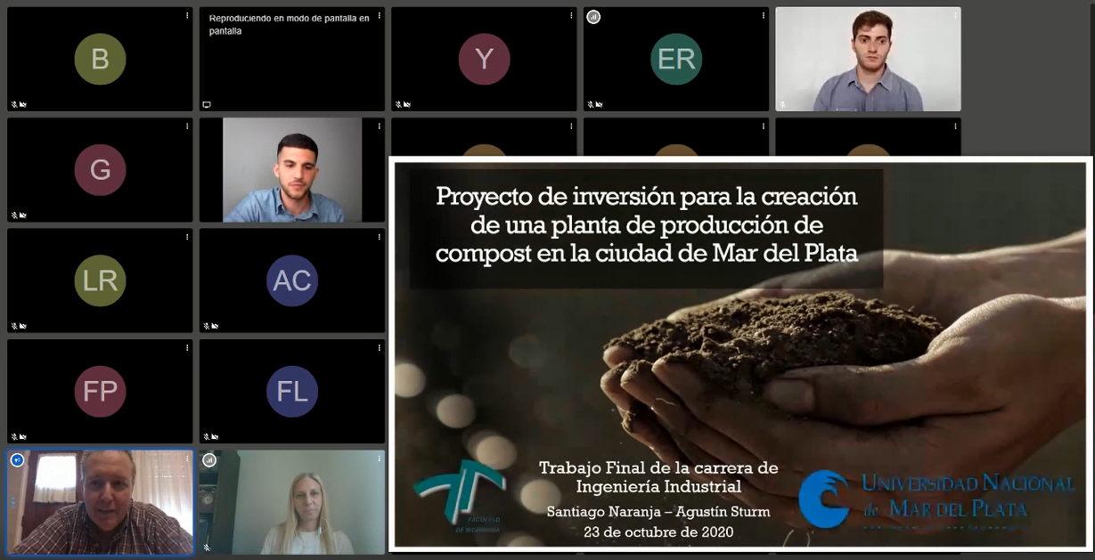 El día 23 de octubre a las 16:00 tuvo lugar la defensa del Trabajo Final: “Proyecto de inversión para la creación de una planta de producción de compost en la ciudad de Mar del Plata”, de los estudiantes Santiago Naranja y Agustín Sturm, que realizaron su exposición desde un Aula Virtual del DII (https://meet.jit.si/