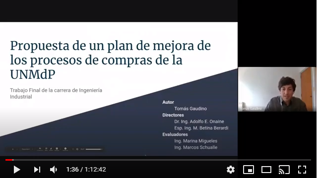 El día 19 de noviembre a las 9:00 hs, se realizó la defensa de Trabajo Final que lleva por título “Propuesta de un plan de mejora de los procesos de compras de la Universidad Nacional de Mar del Plata”, cuyo autor es el estudiante Tomás Gaudino, quien ha sido dirigido por el Dr. Adolfo Onaine y la Esp. Ing. Betina Berardi. La defensa ha sido Virtual mediante la plataforma: https://meet.google.com/oec-