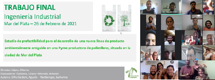 El día viernes 26 de febrero a las 16 hs, se llevó a cabo la defensa del trabajo final de carrera de los estudiantes Agustín D´Alú y Guillermo Nattkemper, que lleva por título "Estudio de prefactibilidad para el desarrollo de una nueva línea de producto ambientalmente amigable en una PyME productora de polietileno situada en MdP". En la oportunidad estuvieron acompañados por su director, el Mg. Ing. Alberto López, los evaluadores Ing. Liliana Gadaleta y Mg. Ing. Antonio Morcela, y una nutrida concurrencia de familiares y amigos. La defensa se realizó en el Aula virtual que el Departamento destina a tal fin.