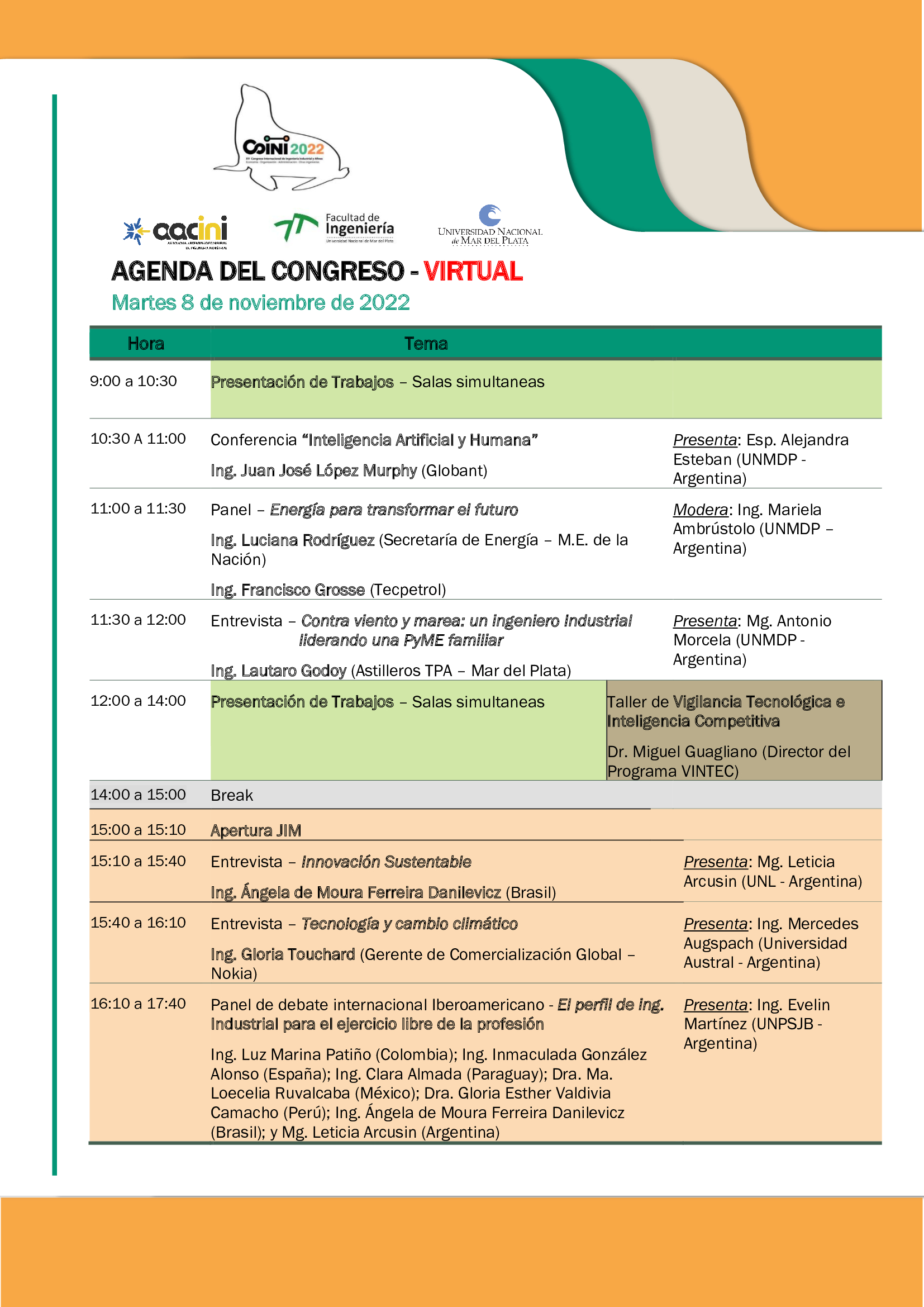Noticias Noticias 08 Noviembre 2022 Agenda XV COINI2022 - Martes 8/11 Agenda XV COINI 2022 - Virtual Martes 8 de noviembre de 2022 Web del Congreso: https://coiniarg.com/
