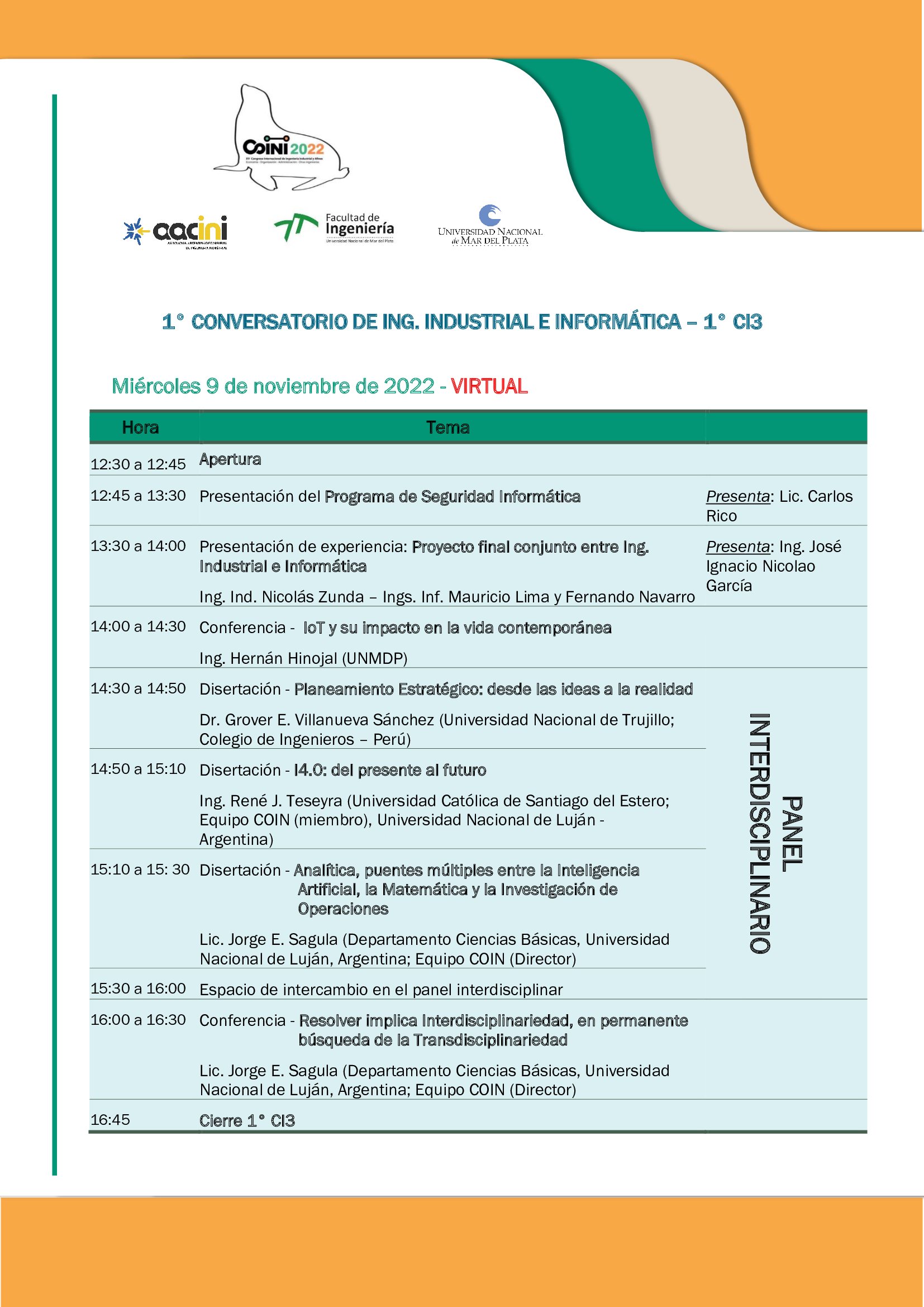 Noticias Noticias 09 Noviembre 2022 1° Conversatorio entre Ingeniería Industrial e Informática - 1°CI3 Agenda XV COINI 2022 - Virtual Miércoles 9 de noviembre de 2022 Web del Congreso: https://coiniarg.com/