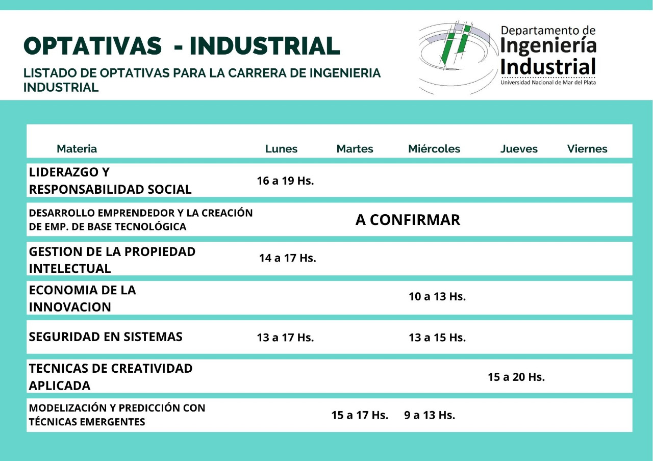 Oferta de optativas 2021 para la carrera de Ingeniería Industrial